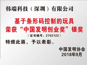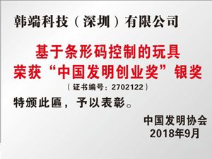 條形碼控制玩具榮獲中國發(fā)明創(chuàng)業(yè)獎--銀獎