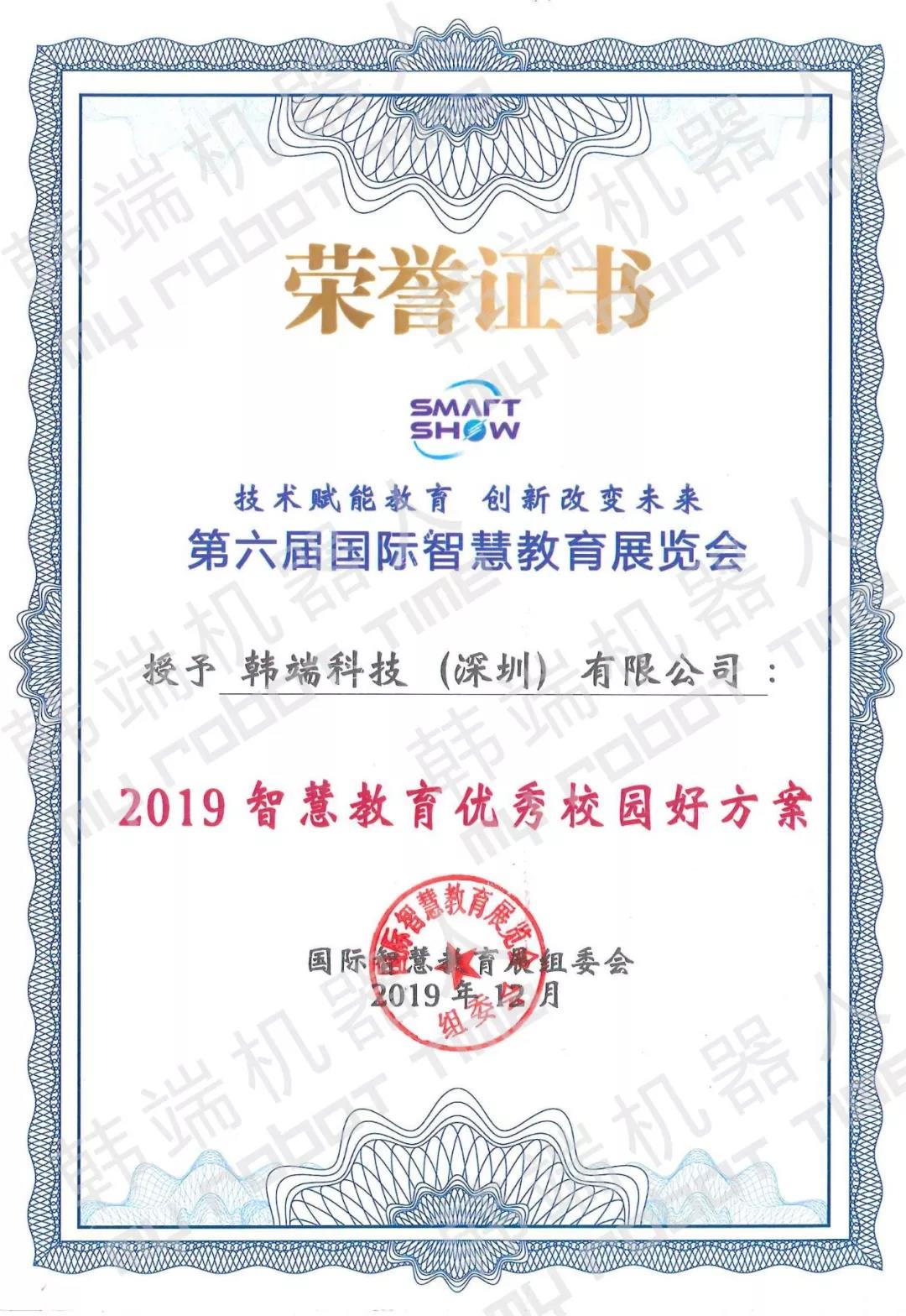 展會期間,韓端機器人憑借高精尖的STEAM課程體系和教育產品榮獲“2019智慧教育優秀校園好方案”,這是對韓端機器人在機器人與人工智能為代表的創新教育表示高度肯定與認可,為韓端機器人持續在教育創新技術發展的過程中提供了強大的動力。