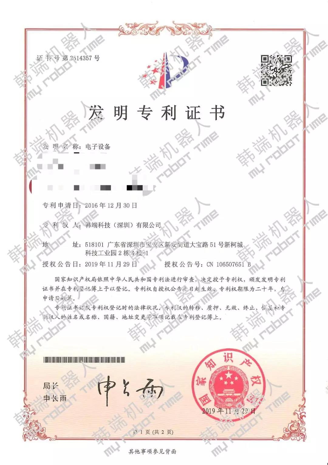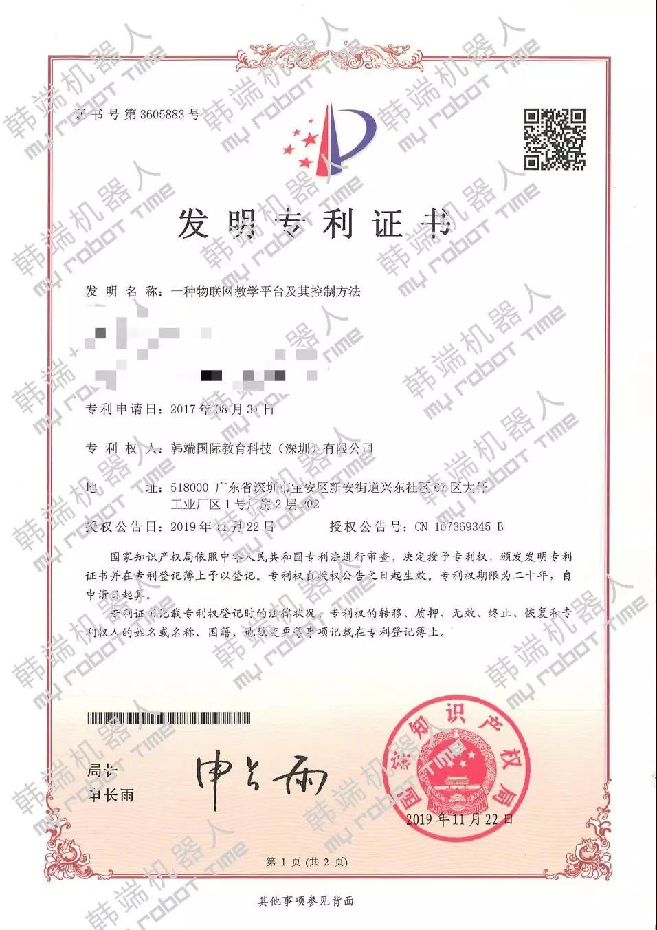 日前,韓端機(jī)器人項(xiàng)目名稱“電子設(shè)備”和“一種物聯(lián)網(wǎng)教學(xué)平臺(tái)及其控制方法”歷經(jīng)嚴(yán)格的形式審查、專家評(píng)審、相關(guān)部門聯(lián)審等程序,成功下發(fā)發(fā)明專利證書,自此韓端專利數(shù)突破百個(gè),攜手創(chuàng)新技術(shù)邁進(jìn)2020年。