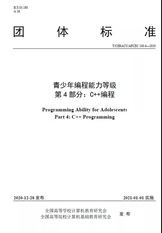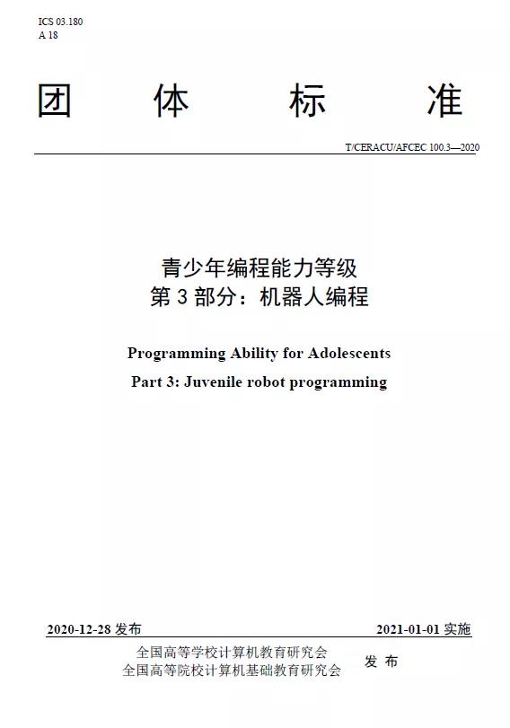 該標準共分為4部分,此前已發布了第1、2部分兩項標準并已實施,第3、4部分標準分別為機器人編程和C++編程。該標準規定了青少年編程能力的等級劃分及其相關能力要求,其中第3部分給出了青少年機器人編程能力的等級及其相關能力要求,適用于青少年編程能力教學、培訓及考核;第4部分給出了青少年C++編程能力的等級及其相關能力要求,適用于青少年C++編程能力教學、培訓及考核。