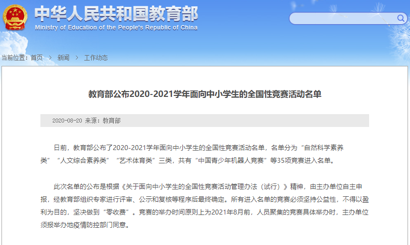 教育部公布的2020-2021學(xué)年面向中小學(xué)生的全國性競(jìng)賽活動(dòng)名單,名單分為“自然科學(xué)素養(yǎng)類”“人文綜合素養(yǎng)類”“藝術(shù)體育類”三類,共有“中國青少年機(jī)器人競(jìng)賽、全國青少年人工智能創(chuàng)新挑戰(zhàn)賽、全國中小學(xué)信息技術(shù)創(chuàng)新與實(shí)踐大賽(NOC)”等35項(xiàng)競(jìng)賽進(jìn)入該名單。