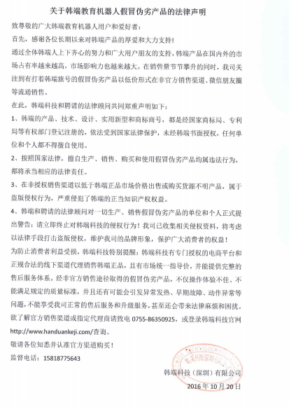 致尊敬的廣大韓端教育機器人用戶和愛好者: