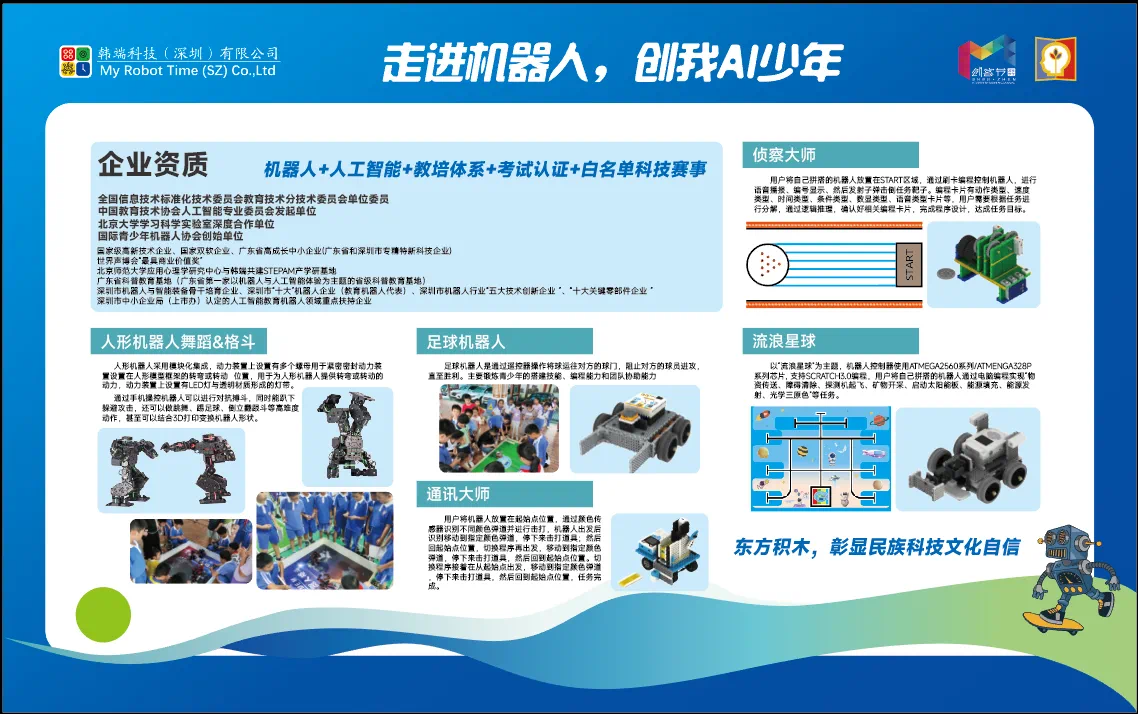 韓端機(jī)器人自成立以來(lái)一直致力于向青少年提供覆蓋全學(xué)齡段的智能教育硬件產(chǎn)品和課程體系,是我國(guó)青少年科學(xué)素質(zhì)教育行業(yè)的拓荒者之一。公司提倡手腦聯(lián)盟,所研發(fā)的“AI教具賽具”注重科技與體育、藝術(shù)相結(jié)合,增強(qiáng)孩子動(dòng)手動(dòng)腦、科學(xué)創(chuàng)作的能力,培養(yǎng)學(xué)生人工智能科學(xué)素養(yǎng)和人文科技素養(yǎng)。