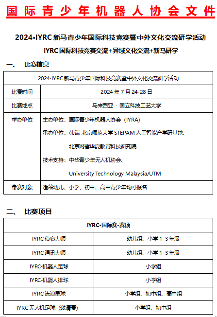 關于舉辦2024IYRC國際青少年機器人競賽(新馬)邀請賽暨科技研學活動的通知